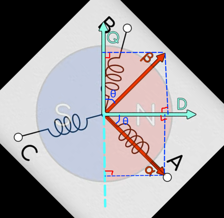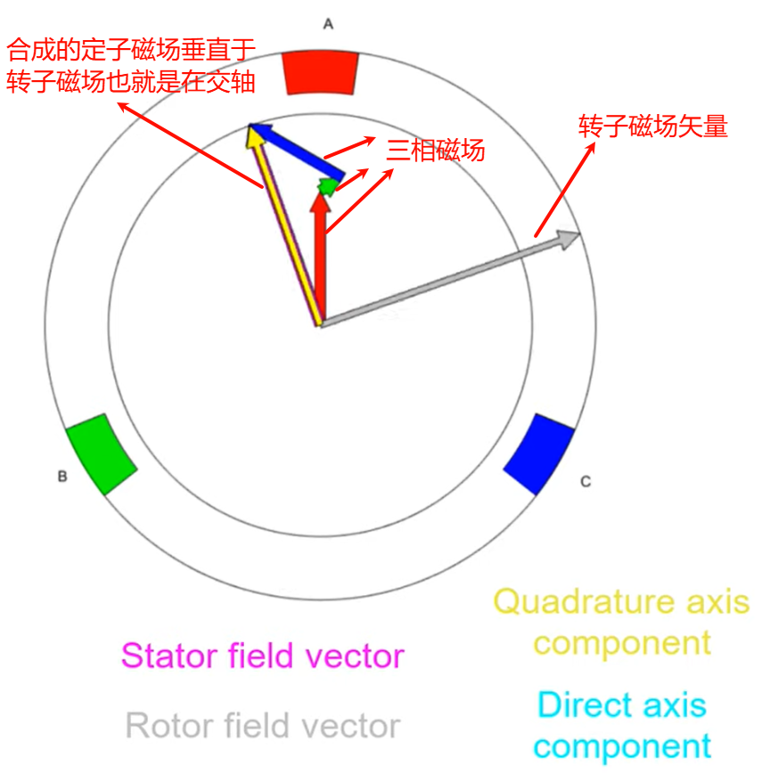 那么因为我们是有三相,所以本质上是要三相磁场合成的矢量垂直于转子磁场。