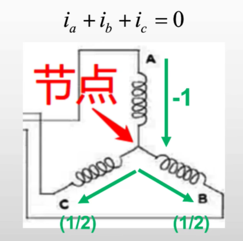 $$ \begin{array}{l} \Large I_\alpha = I_a - \frac{1}{2} (I_b+I_c) \\\\ \Large I_\beta = \frac{\sqrt{3}}{2}(I_b -I_c) \end{array} $$另外我们知道电流是有方向的,线圈中电流方向不同,则磁场方向也不同。·根据基尔霍夫电流定律:在任何电路中,流入任何一个节点的电流之和等于流出该节点的电流之和。 也就是IA+IB+IC=0