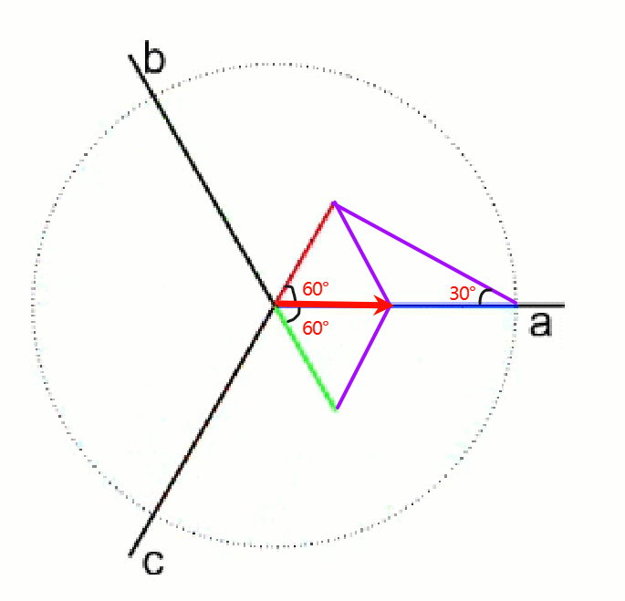 其实非常容易证明,如下图,就是在角度为0时,IA=I_max, IB=IC =0.5I_max 又因为IB,IC的夹角是120°,所以它们的合成矢量长度为0.5I_max 方向也为0。所以合成矢量为1.5I_max. 事实上不止是0角度时是一样,对于任意电角度θ,都可以推导出 IA+IB+IC 合成 矢量为长度为1.5I_max,角度为θ的矢量。