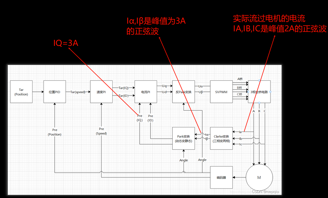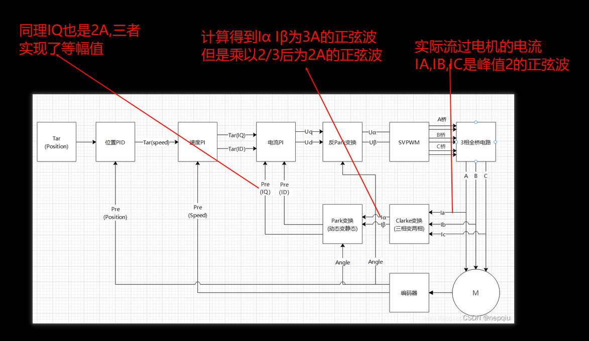 那么如果想做到IA-IB-IC的峰值 和Iα Iβ 的峰值及IQ做到一样,该怎么做。这个实际上就是谁去对齐谁的问题。首先需要知道一件事请是IA,IB,IC是实际的流过电机电流,是实实在在的物理量。而IQ,Iα Iβ它是中间量。所以要想做到统一,实际上就是别的值做到和IA,IB,IC统一,所以要怎么做其实非常简单,就是Iα Iβ 乘以2/3,也就是也就是等于IA的实际峰值。它也会连带的将IQ,ID乘以2/3, 当这个值和速度PI输出值Tar(iQ)去做PI时,实际上就是实际IA的峰值去和Tar(iQ)做误差的PID计算,所以在这个负反馈循环系统之下。调控的Tar(iQ)大小就是调控的实际的IA,IB电流的大小。