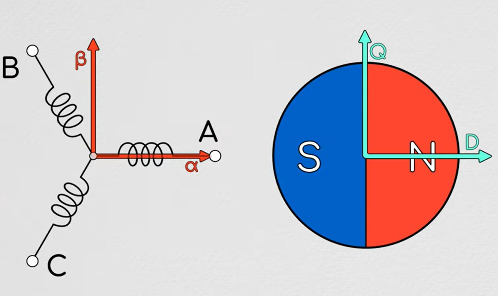 如果从最本源的地方看的话,就是和转子的圆正切的力是和转速直接相关的。也就是和转子磁链垂直方向的磁场大小它和和速度直接相关。另外考虑到效率和振动噪音等问题,它在和转子磁链平行的方向为0是最好的。这两个都是非自身时变的,非耦合的两个对象。那么现在Clarke变换就是先将这三个变量量变成正交的两个量。