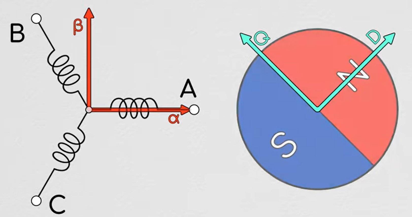 转子的运动其实是圆周运动,那么要做到效率最高,显然是全部都力作用在切线的方向上效率是最高的,又由于驱动转子的力是靠磁力,所以就是要生成一个磁场方向垂直于转子磁场的一个磁场。所以我们的目标是要三相合成的磁场矢量在全部在垂直于转子磁场的方向也就是交轴(Quadrature axis 也叫q轴,并且做圆周运动,这样就可以拉着转子转动,而平行于转子磁场的方向上,也就是直轴(Dircet axis 也叫d轴) 则要控制为0,否则它可能会产生一个吸力,它阻碍运动运动浪费能量不说,因为这个径向的力还会增加轴承负荷、产生振动和噪音。