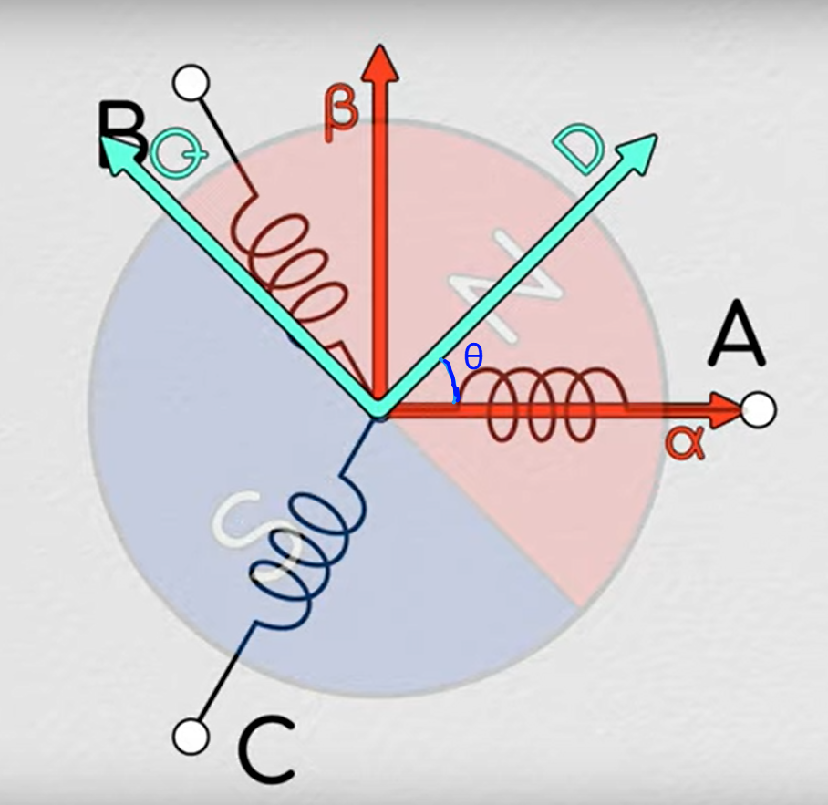 当转子转动θ度时, Iα-Iβ坐标系不动,但是q-d坐标系随着转子转动而转动。